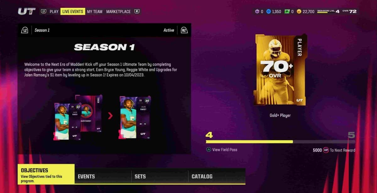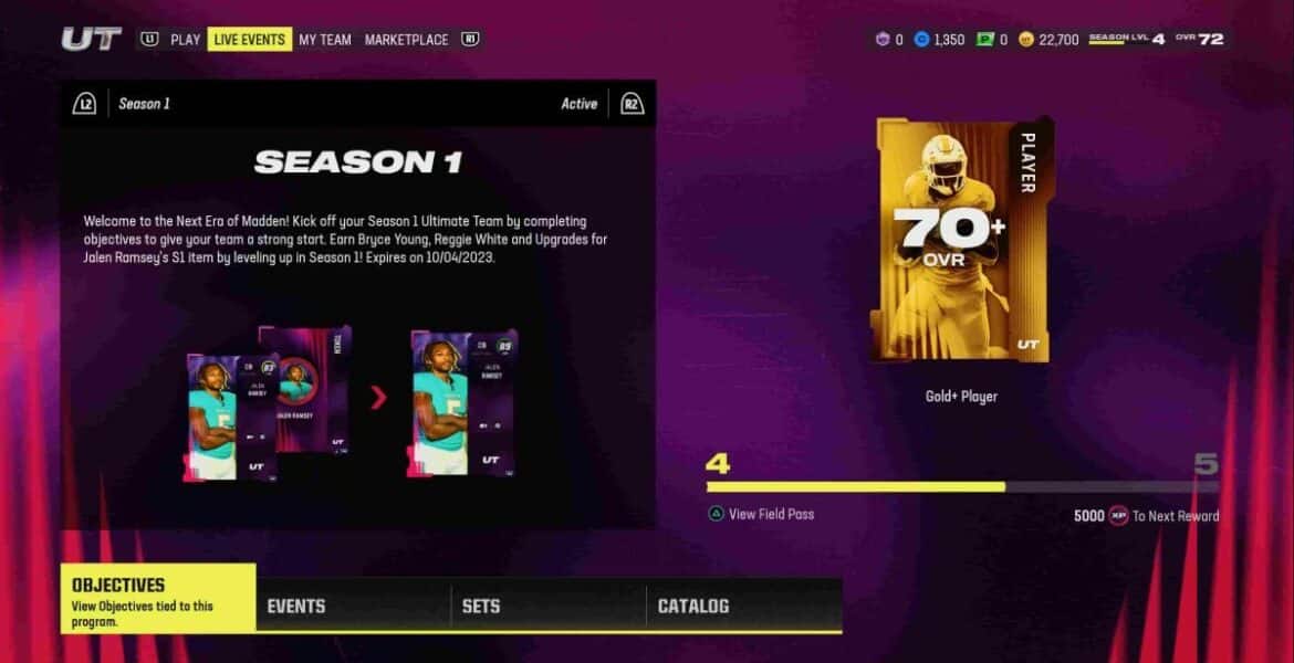 Pour sélectionner l’onglet Événement en direct, appuyez sur R1 ou L1. Cela sélectionnera l’un des onglets Play, Événements en direct, Mon équipe ou Marketplace. Lorsque vous avez sélectionné l’onglet Événement en direct, vous devriez voir l’événement de la saison 1 et votre progression sur le terrain.
