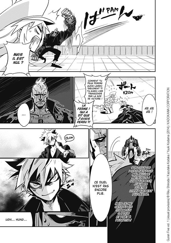 Bon, c’est vrai que Guren Five n’a rien de très original au premier abord. Mais finalement l’auteur prend un virage différent qu’on l’aurait cru. Le personnage de Raku et son franc parler font mouche et offrent de bons moments. Pas de prise de tête ici. L’auteur nous sert un scénario plein de rebondissements et un rythme soutenu tout le long de ce premier tome. Si vous aimez l’action, vous allez être servis.