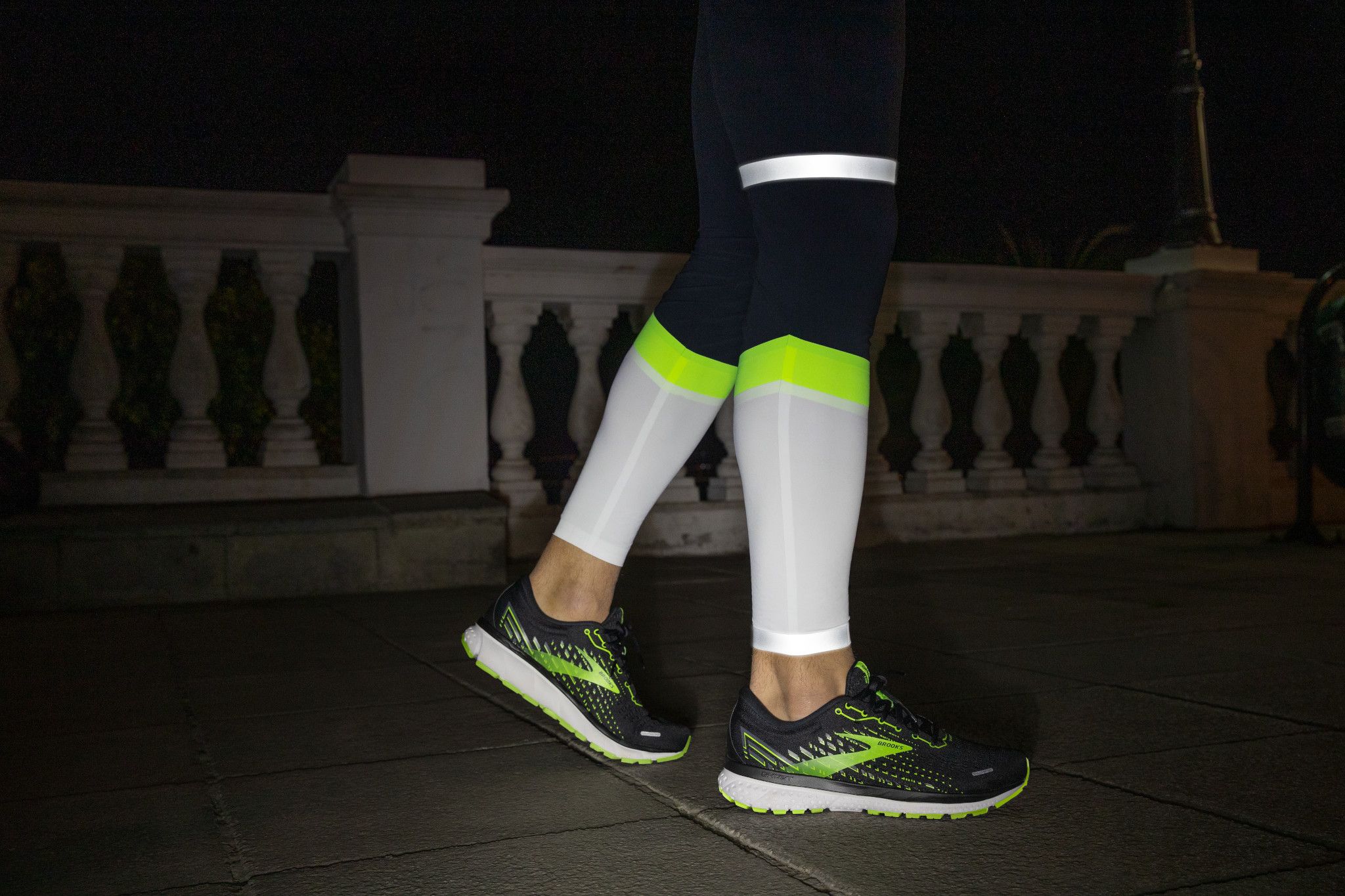 Tous les produits de cette gamme sont dotés de bandes réfléchissantes qui renvoient la lumière des phares de la voiture directement vers le conducteur. Elles sont positionnées dans des zones où les mouvements sont intenses, comme les coudes, les poignets et les chevilles. D’après Brooks, l’intensité lumineuse de ces bandes correspond au minimum à la lumière émise par 300 bougies brûlants ensemble au même endroit.
