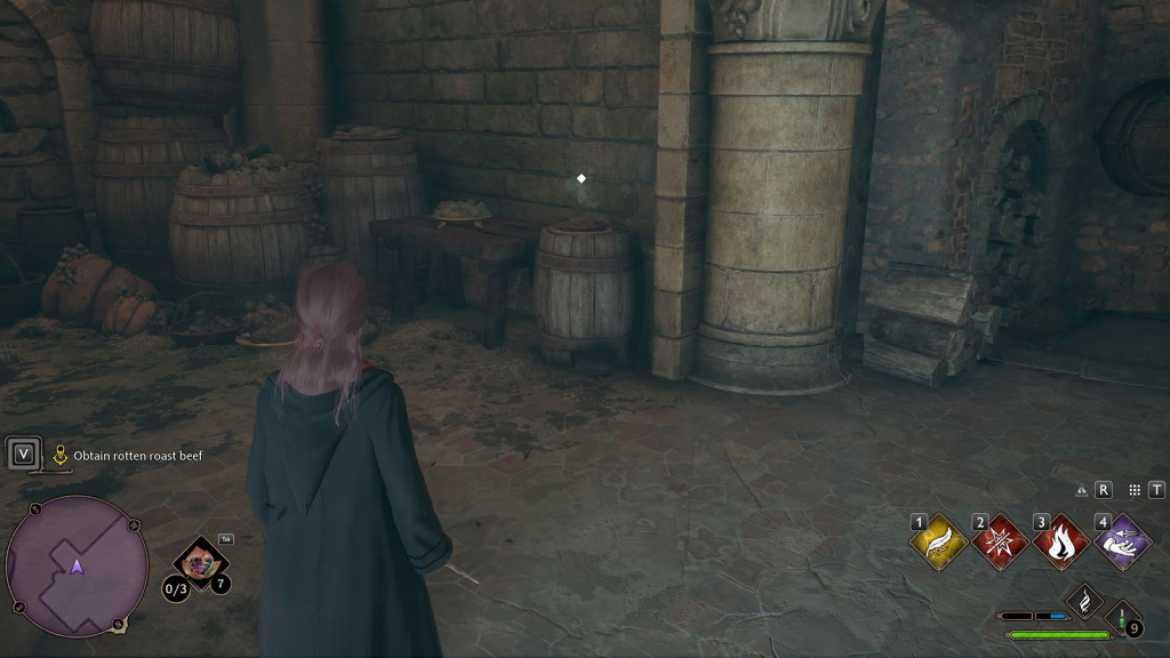 Pour trouver le rôti de bœuf pourri, dirigez-vous vers le sud vers le fond de la pièce, passez les tables, jusqu’à ce que vous trouviez une petite alcôve pleine de barils. Vous saurez que vous vous rapprochez lorsque votre personnage mentionne une odeur dégoûtante à proximité. Au sommet de l’un de ces tonneaux se trouve le rosbif, que vous pouvez ramasser pour lancer une cinématique avec l’un des elfes de maison. Suite à cela, vous obtiendrez le bœuf et progresserez dans cette partie de la quête !