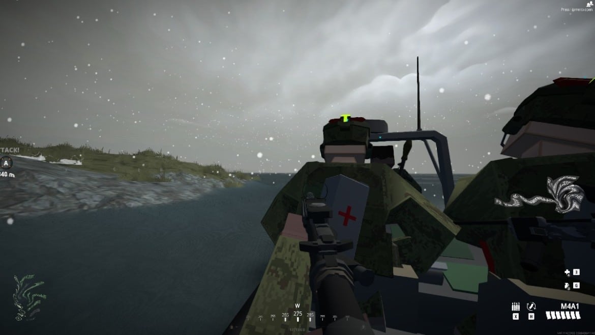 Certaines cartes, comme celle de la photo ci-dessus, vous démarrent directement dans un véhicule. Avant de pouvoir atterrir, vous devrez apparaître dans un bateau et dirigez-vous vers le continent dans une entrée étonnamment dramatique. Une fois que vous avez touché terre, vous devrez quitter le véhicule en appuyant sur F encore une fois, et préparez-vous à l’action.