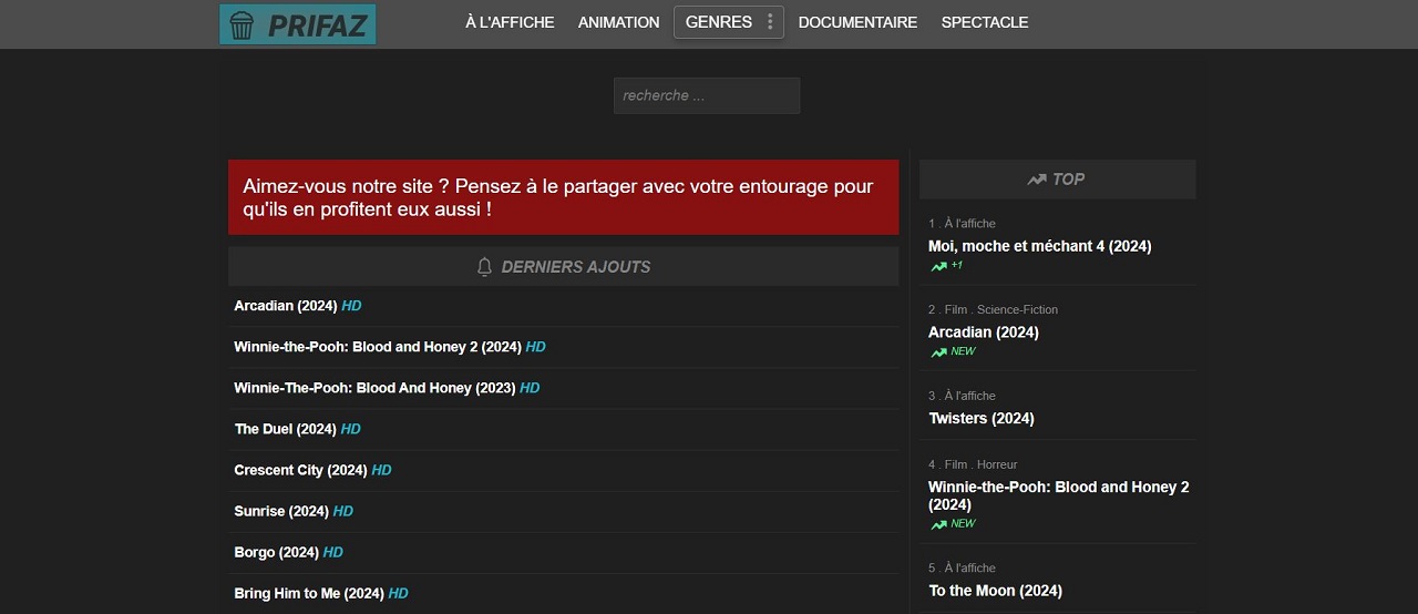 Vous l’aurez compris, Prifaz propose des contenus pour tous les goûts. Le site propose principalement des films dans les genres précités mais vous pourrez également y trouver des documentaires, des spectacles et des animations.