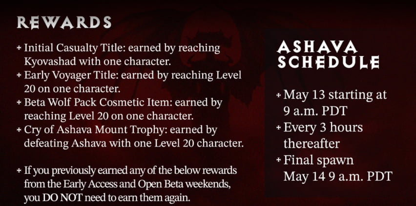 En parlant d’Ashava, ce week-end bêta introduit également une nouvelle récompense exclusive, le Cry of Ashava Mount Trophy. En battant Ashava au moins une fois avec un personnage de niveau 20, vous serez éligible pour cet objet et le recevrez une fois le jeu officiellement lancé en juin. Le boss apparaît pour la première fois le 13 mai à 9 h 00 HAP et réapparaît toutes les trois heures jusqu’au 14 mai à la même heure.