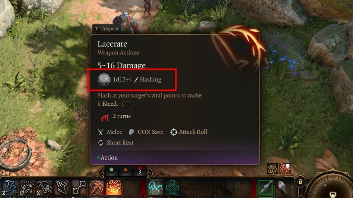 Dans ce cas, la compétence Lacérer roule pour 1d12+4 Dégâts de coupe. Cela signifie qu’une matrice à 12 faces est laminée et que 4 sont ajoutées au nombre de laminés, ce qui signifie que les dommages peuvent être compris entre 5 et 16 au total.