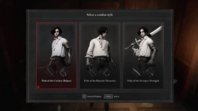 Au début du jeu, vous devrez choisir entre trois chemins différents: Chemin du grillon, Chemin du bâtard et Chemin du balayeur. Ce choix affecte votre style de combat et vos attributs au début du jeu mais n’a aucune influence sur l’histoire en général.