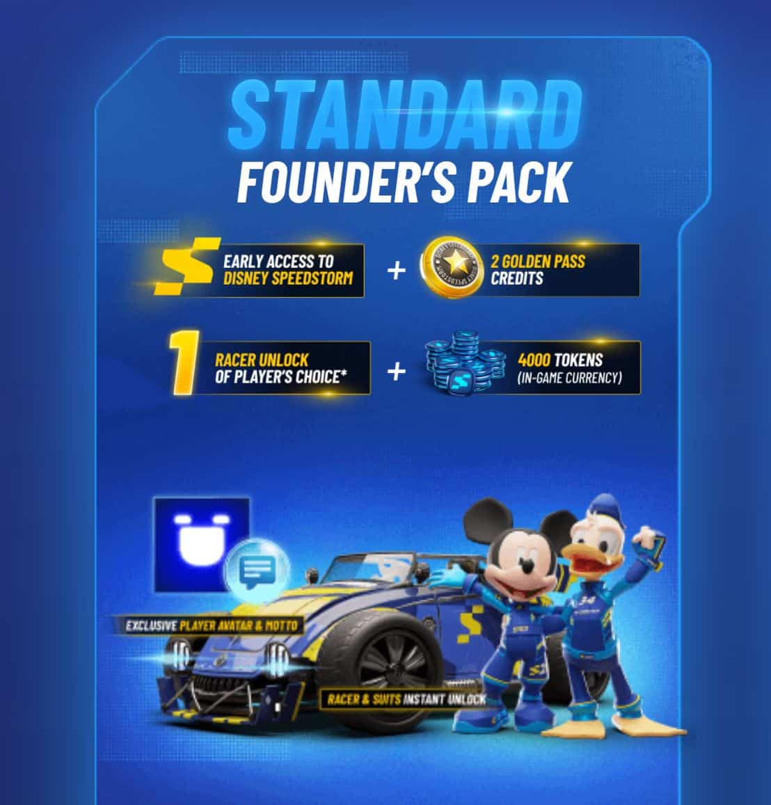 Le pack du fondateur de Disney Speedstorm est rempli de nombreux goodies dans le jeu en plus de jouer tôt. Vous recevrez ce qui suit si vous achetez le pack de fondateur standard.