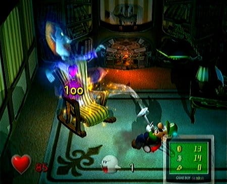 Tout au long de l’aventure, vous allez devoir nettoyer le manoir de tout ses fantômes à l’aide de votre…. aspirateur. Très comique, cette arme s’utilise comme les rayons des Ghostbusters, dont le clin d’œil est clairement affiché ! Chaque fantôme possède une « barre de vie » exprimée en nombre, et il faut que vous aspiriez le fantôme jusqu’à ce que ce nombre tombe à 0 pour que le fantôme soit capturé ; naturellement, plus ce nombre sera élevé, plus le fantôme sera coriace !