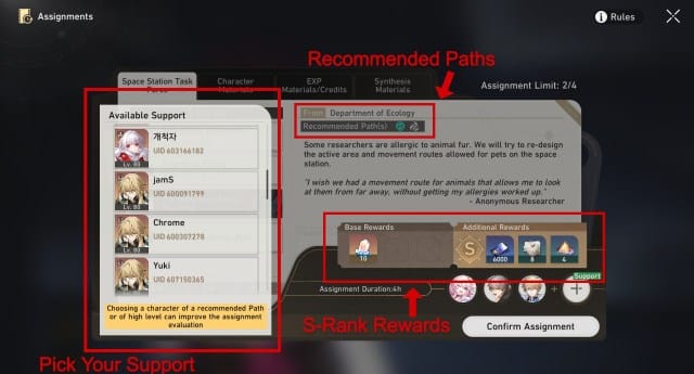Il y a trois niveaux; Or, violet et bleu. La durée de ces tâches ainsi que les récompenses diffèrent les unes des autres, l’or étant l’affectation la plus longue à huit heures mais donnant les meilleures récompenses et les bleues d’environ 3-4 heures avec des récompenses petites mais toujours substantielles. Tout comme vos tâches habituelles, vous devrez envoyer un Pathfinder particulier pour mener à bien la mission. Votre rang et vos récompenses changeront en fonction du nombre de Chemins que vous envoyez pour la mission. En atteignant S-Rank, vous recevrez des récompenses substantielles telles que des jades stellaires, des crédits, des matériaux de niveau supérieur et des fragments de relique.