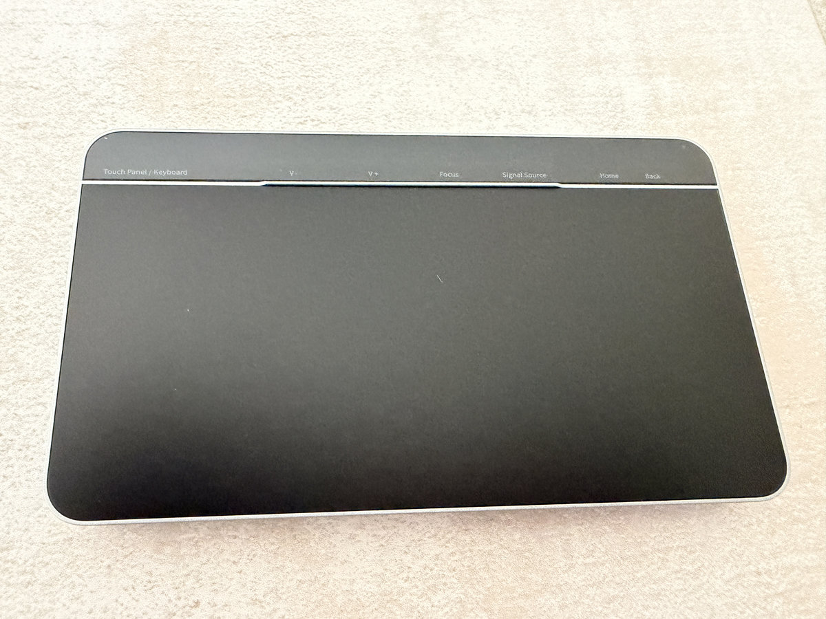 Un bouton dans le coin supérieur gauche permet de basculer entre le mode trackpad (pour naviguer avec le curseur) et le mode clavier (qui illumine un clavier complet sous la surface tactile). La navigation est étonnamment fluide et intuitive – bien plus agréable que les télécommandes classiques de projecteurs.