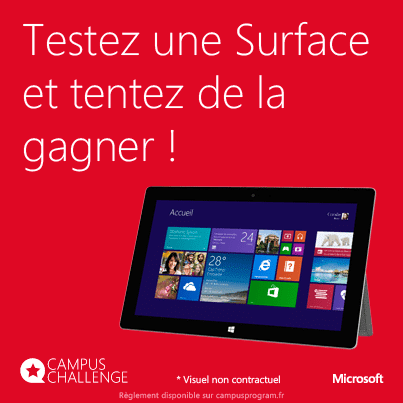 Le Challenge : Une fois la tablette Surface remise, le Challenge peut commencer. Les participants pourront alors tenter de remporter une Surface 2 en partageant très largement leur expérience auprès de leurs proches et sur les réseaux sociaux (Facebook et Twitter). Chaque action rapportant un certain nombre de points, plus ils partageront leurs expérience et impressions, plus ils gagneront des points. Le meilleur participant de chaque ville remportera, à l’issue de son test, une Surface 2. 4 Surface 2 sont en jeu chaque semaine ! Pour plus d’information ou pour s’inscrire au Challenge, rendez-vous sur le site officiel.