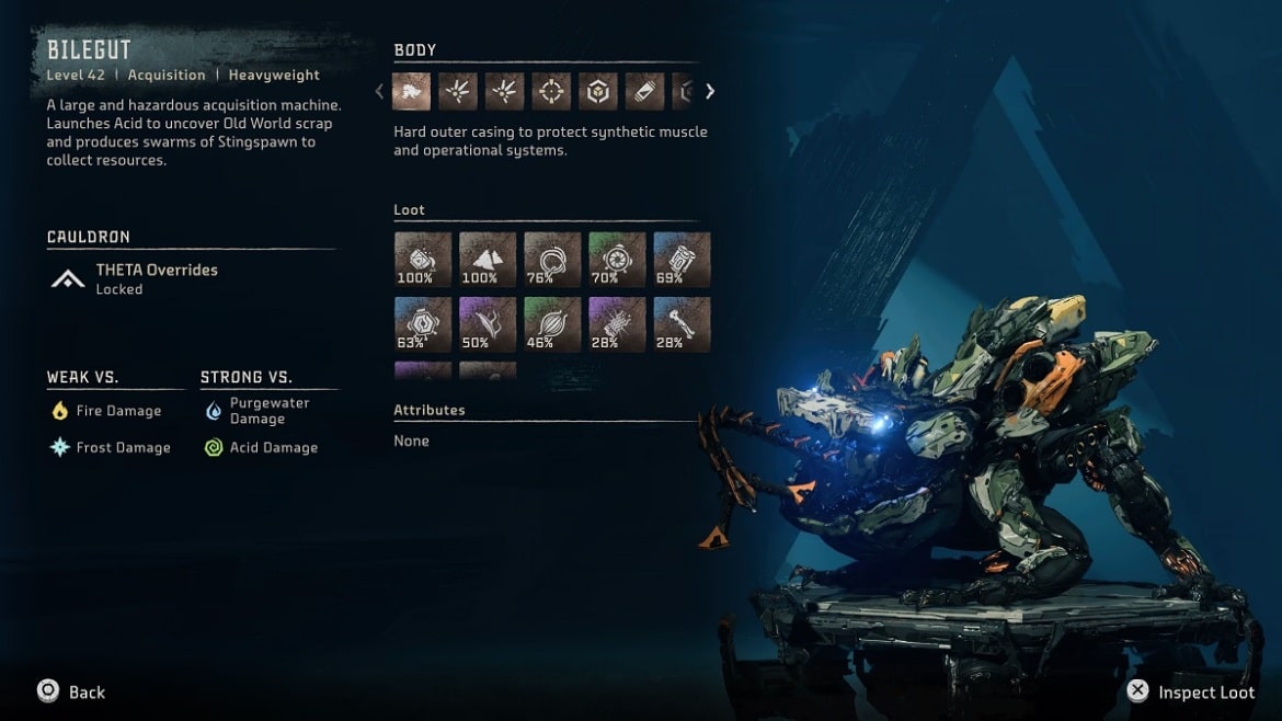 La première nouvelle machine que vous rencontrerez à Burning Shores est le Bilegut – une grenouille robot ! On s’attendrait à ce que le crapaud mécanique soit petit et que cette bestiole ne pose pas de gros problème à Aloy, cependant – c’est gros et très très acide. Pire encore, il peut également produire des essaims de Stingspwn – des insectes mécaniques qui peuvent facilement inonder le champ de bataille.