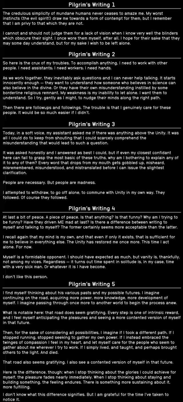 Si vous avez besoin de revoir Pilgrim’s Writing, voici une image en taille réelle qui compile les cinq parties.