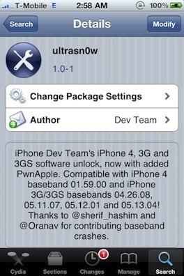 La Dev-Team a mis à jour son logiciel UlstraSn0w (version 1.0-1) pour débloquer l’iPhone 4 et le rendre utilisable sur le réseau mobile de votre choix. Il vous faudra tout d’abord, dans Cydia, ajouter la source repo666.ultrasn0w.com, puis effectuer une recherche sur « Ultrasn0w » et l’installer.