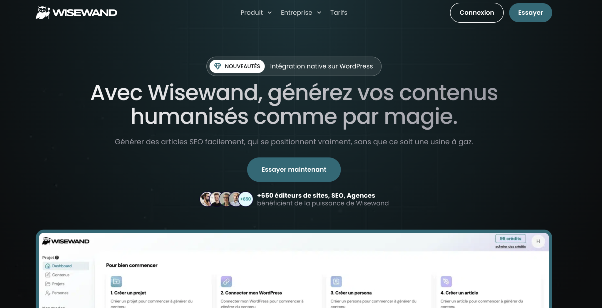 | Wisewand | Contenu SEO industrialisé | Fort | Oui | Oui (orienté production) |