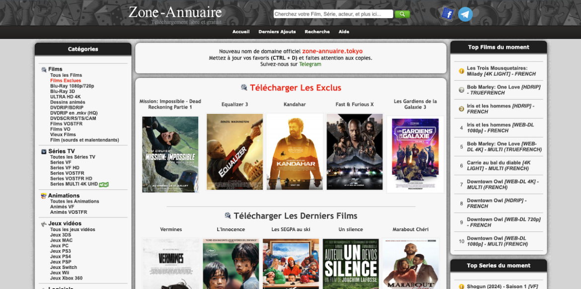 Zone Annuaire est apparu en 2020 comme le successeur direct de Zone Téléchargement. Il fonctionne sur le même principe que d’autres plateformes comme Cpasbien pour le torrent, un site qui avait été fermé en 2016 suite à l’arrestation de ses administrateurs par les autorités françaises. Concrètement, il s’agit d’un annuaire de liens de téléchargement direct (DDL) : le site ne stocke aucun fichier lui-même, mais référence des liens hébergés sur des plateformes tierces comme 1fichier ou Uptobox.